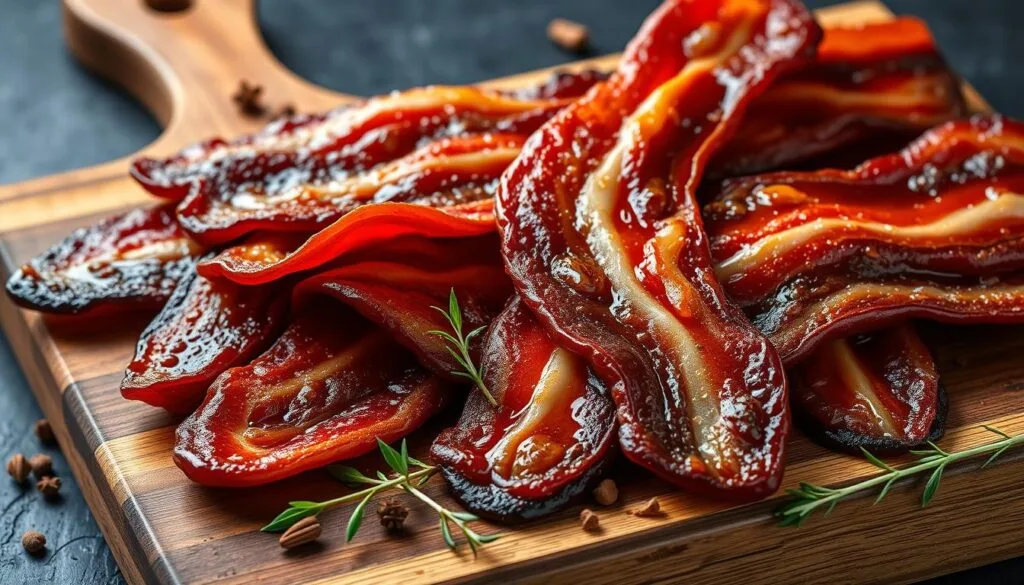 Exploring new tastes, you’ll see beef bacon is not just a pork bacon substitute. It’s a unique wonder in the smoked meats world. Its firm texture and beefy smell make it a favorite among gourmet bacon enthusiasts who want a healthy yet indulgent treat.