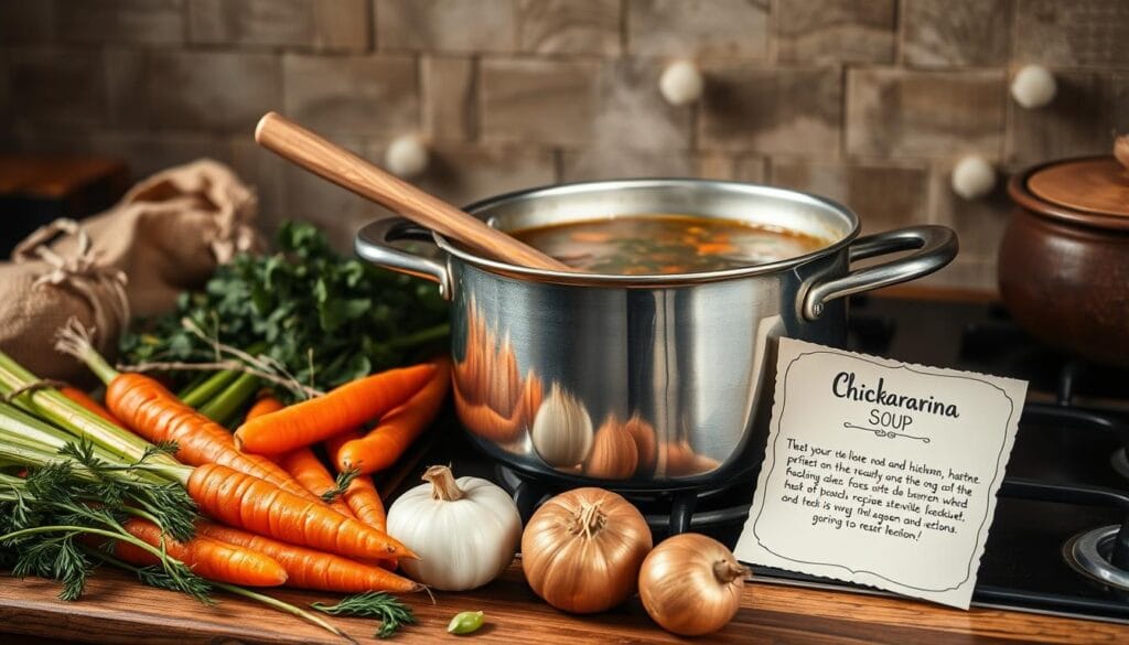 By following these steps, you’ll make a tasty soup starter. This will be the base for your Chickarina soup. The broth will be rich and velvety, ready for the chicken meatballs and pasta.