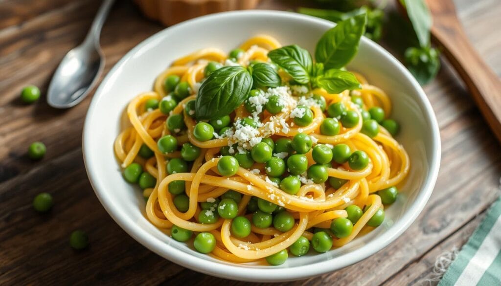 This easy pasta and peas recipe is a great starting point. You can try different pasta shapes, add proteins, or more veggies. This way, you can make it your own.
