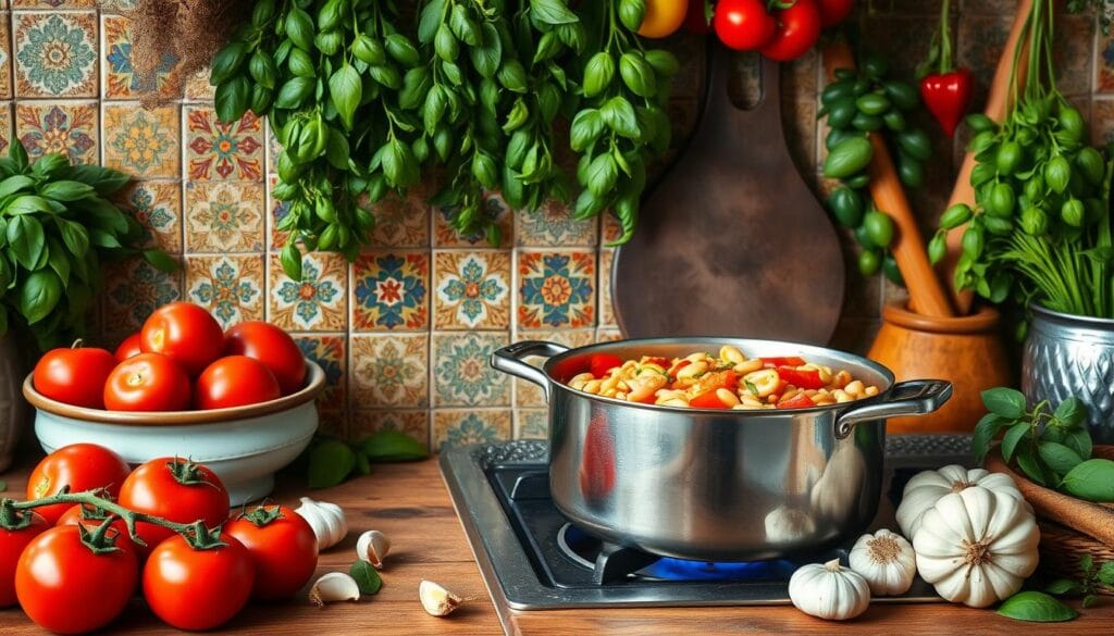 Onions and garlic are key to Pasta Fagioli’s flavor. As they cook, they release oils that add a warm, caramelized taste. Onions bring a sweet touch, while garlic adds a strong, earthy flavor.
