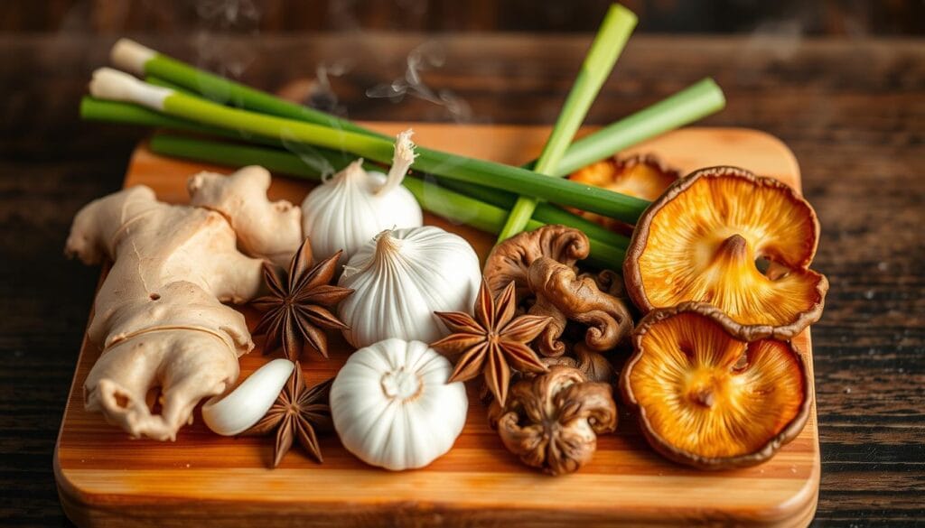 - Ginger, scallions, soy sauce, and Shaoxing wine for flavor